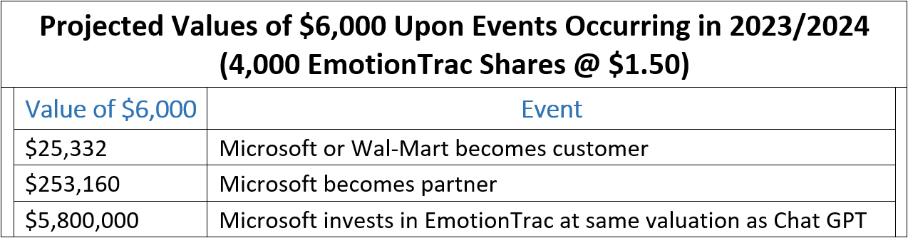 Anyone who views the video clip updates below will agree that the probability is high for each of the events in the above table to occur. Since June 2023 EmotionTrac has been in discussions with the leaders of three of Microsoft’s divisions. Each of the Microsoft divisions need EmotionTrac’s patented software and digital ad testing solution. Most significantly the integration of EmotionTrac’s system into Chat GPT will enable the growth rate of Microsoft’s AI products to accelerate.